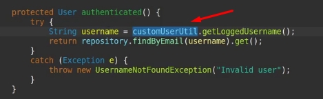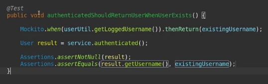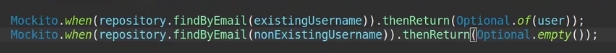 Como pode observar no método acima, dentro do try temos um cenário do repository executando o findByEmail (passando o username). Precisamos testar, portanto, este cenário em pauta.