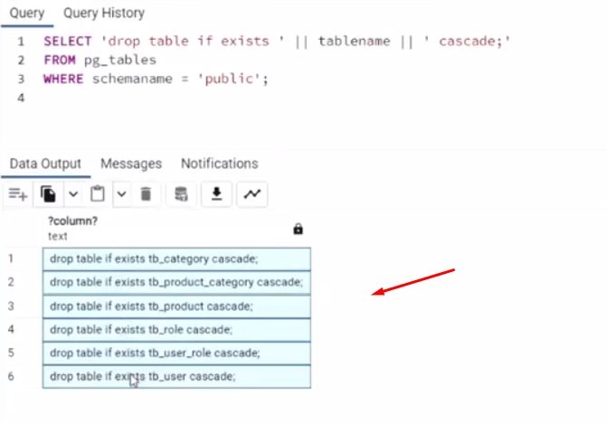 WHERE schemaname = 'public';Ao rodar esse código no pgAdmin, ele nos retorna os drop tables de TODAS as tabelas e você pode selecionar a que preferir: